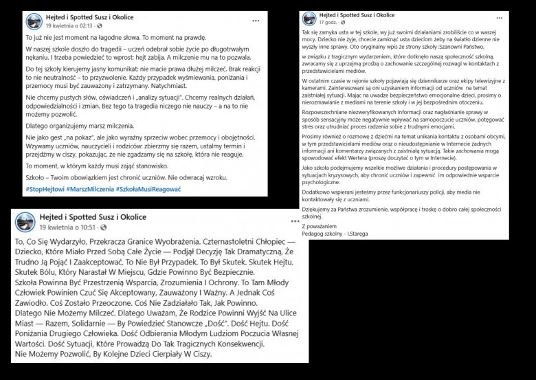 Po tragedii w Suszu nie ma już mowy o ciszy. Mieszkańcy piszą o hejcie, bólu i obojętności, a w sieci zaczęły pojawiać się apele o marsz milczenia. W emocjonalnych wpisach internauci wprost piszą, że hejt zabija, a brak reakcji nie jest neutralnością. Coraz więcej osób domaga się jasnych odpowiedzi i realnych działań, żeby podobna historia już nigdy się nie powtórzyła.