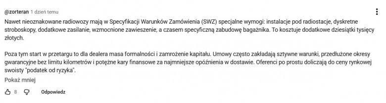 Jednak już pod samym nagraniem pojawiły się głosy, że burmistrz nie wziął pod uwagę wszystkiego co składa się na cenę radiowozu.