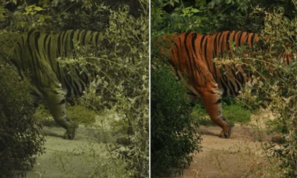 Ludzie są trichromatami. To oznacza, że widzimy trzy podstawowe barwy: czerwoną, zieloną i niebieską. Mieszając się one tworzą szeroką paletę kolorów, w tym bardzo intensywny pomarańcz, który widzimy u tygrysów. Jednak większość dużych zwierząt kopytnych - główne ofiary tygrysów - ma zupełnie inny układ wzrokowy. Są dichromatami, co oznacza, że widzą tylko dwa kanały kolorów: zielony i niebieski. Nie mają receptorów odpowiedzialnych za odbiór czerwieni, a więc nie są w stanie odróżnić koloru czerwonego, pomarańczowego ani różowego.
