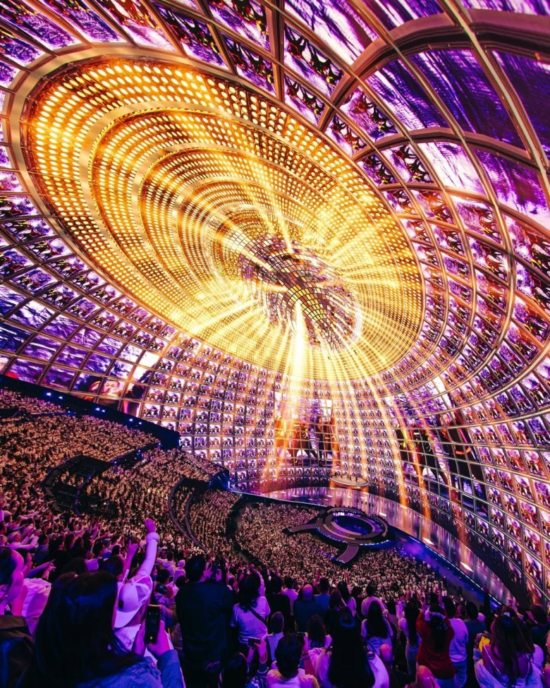 Najbardziej charakterystycznym elementem budynku jest jego zewnętrzna powłoka. To ekran LED o powierzchni około 54 tysięcy metrów kwadratowych, złożony z milionów diod. Dzięki temu kopuła może wyświetlać animacje widoczne z wielu kilometrów. Na ekranie pojawiają się między innymi gigantyczne oko, planety, fale czy specjalnie zaprojektowane wizualizacje tematyczne.