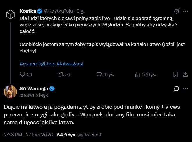 Do sprawy publicznie odniósł się też znany youtuber Wardęga, który zaproponował konkretne rozwiązanie. Zaoferował, że porozmawia z YouTube w sprawie technicznej zamiany pliku - pod warunkiem, że odtworzony film będzie miał dokładnie taką samą długość jak oryginalna transmisja. To pozwoliłoby zachować liczbę wyświetleń i komentarzy przypisanych do oryginalnego live'a.