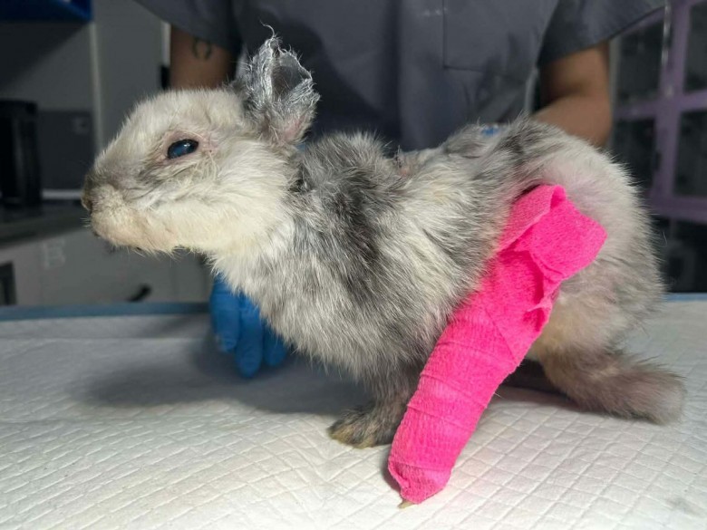 Królik został szybko przewieziony do całodobowej kliniki weterynaryjnej, gdzie lekarze ocenili jego obrażenia. Były poważne - weterynarze stwierdzili m.in. równo obcięte uszy, głęboką ranę ciętą na grzbiecie odsłaniającą tkanki, uszkodzenia warg, złamanie jednej tylnej łapy oraz zwichnięcie drugiej. Zwierzę było też skrajnie wychudzone, z wyraźnie widocznymi kośćmi i niemal całkowitym zanikiem mięśni. Do tego doszły zaropiałe oczy i liczne odparzenia.