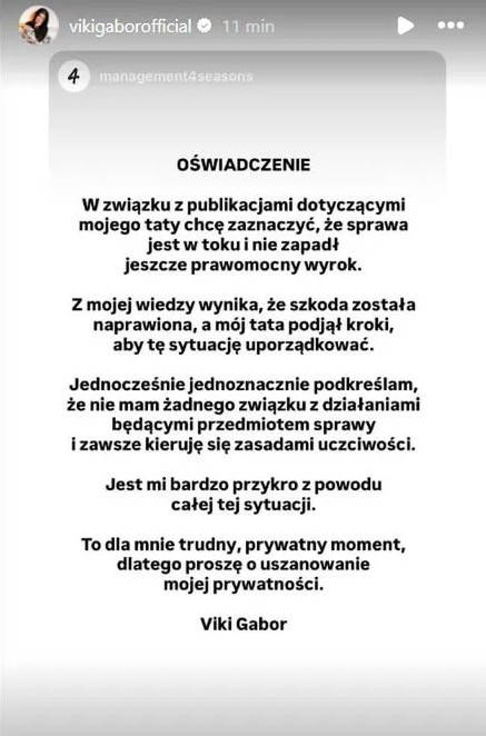 Oświadczenie pojawiło się za pośrednictwem menedżmentu artystki, a później zostało udostępnione również w mediach społecznościowych. Viki Gabor zaznaczyła, że z jej wiedzy wynika, iż szkoda została naprawiona, a jej ojciec miał podjąć działania, by uporządkować całą sytuację. Jednocześnie podkreśliła, że zawsze kieruje się zasadami uczciwości i poprosiła o uszanowanie prywatności.