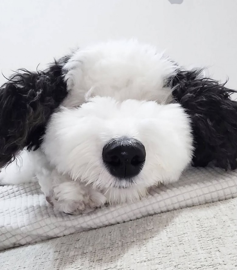 Bayley to nie animacja ani efekt sztucznej inteligencji. To prawdziwy pies rasy sheepadoodle, czyli krzyżówka owczarka staroangielskiego i pudla. Charakterystyczna biała mordka, czarne opadające uszy i duży, okrągły nos sprawiają, że na wielu zdjęciach wygląda niemal jak rysunkowa postać.