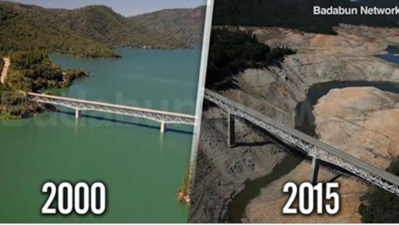 Znajduje się w Azji i niewiele potrzeba do jego całkowitego wyschnięcia. Pierwsze zdjęcie zrobiono w 2000 roku, drugie w 2014.