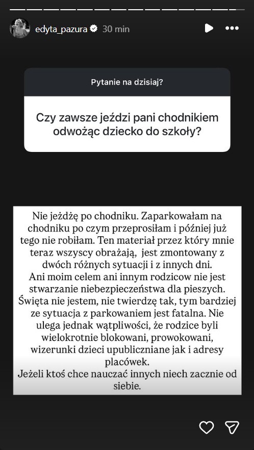 Pazura zaznaczała, że sama tego dnia miała zaparkować na wyznaczonym miejscu parkingowym. Jednocześnie przekonywała, że nawet jeśli część rodziców zatrzymuje się na chodniku, to ma robić to z zachowaniem miejsca dla pieszych. W swoich relacjach poszła jednak dalej i oskarżyła Konfiturę o manipulowanie nagraniami, tak by kierowcy byli przedstawiani w jak najgorszym świetle. Zapowiedziała też, że za każdym razem, gdy zobaczy go pod szkołą z kamerą, będzie dzwonić na policję.