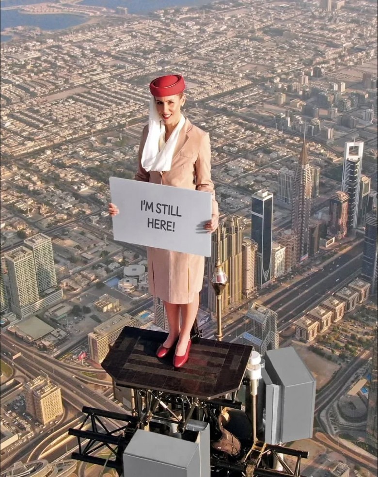 Kiedy w 2021 roku linie lotnicze Emirates opublikowały swoje najnowsze nagranie promocyjne, internauci przecierali oczy ze zdumienia. Na filmie widać kobietę stojącą na samym szczycie Burdż Chalify w Dubaju - najwyższego budynku świata. W tle rozciąga się panorama miasta, a ona trzyma tabliczki z napisami: „I’m still here!”.
