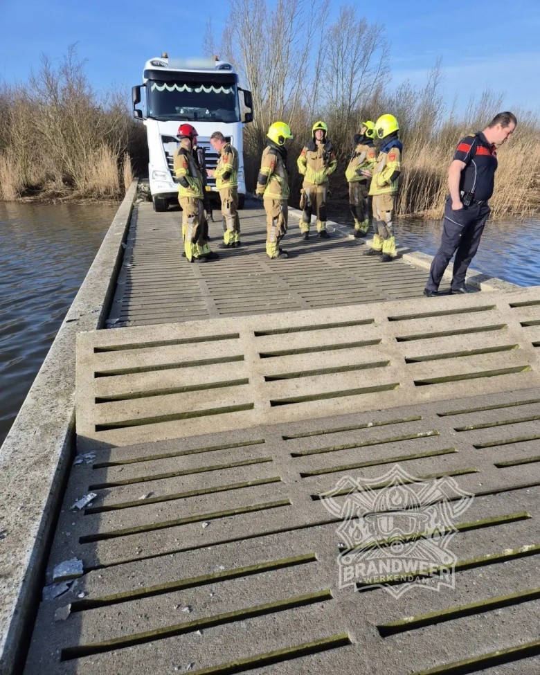 Jak opisano, zestaw zdołał przejechać przez dwie takie przeprawy, ale przy trzeciej skończyło się katastrofą. Płyty zarwały się pod osią napędową ciągnika, czyli tam, gdzie nacisk był największy. W efekcie ciężarówka została unieruchomiona i zawisła w bardzo trudnym położeniu. Kierowca zdołał samodzielnie opuścić kabinę i nie odniósł obrażeń, a pojazd nie wpadł całkowicie do wody. Na tym jednak problemy się nie skończyły.