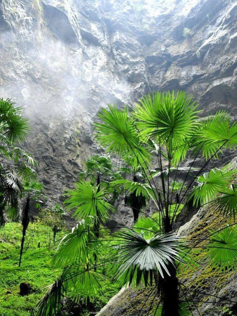 Na dnie lejka naukowcy znaleźli gęsty las z drzewami sięgającymi nawet 40 metrów wysokości, a podrost był tak wysoki, że badacze poruszali się w nim z trudem. Wewnątrz panował zupełnie inny mikroklimat - chłodniejszy, wilgotniejszy i bardziej stabilny, co pozwoliło przetrwać tam unikalnym gatunkom roślin. W ścianach lejka odkryto także trzy wejścia do systemu jaskiń, co sugeruje, że ten leśny ekosystem może być częścią większej sieci podziemnych korytarzy i cieków wodnych.