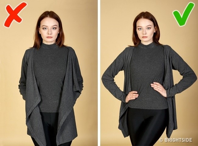 Rozwiązanie: Trzymaj ręce w niewielkiej odległości od ciała. Użyj je do tworzenia prostych linii i kątów podkreślających twoją kobiecą sylwetkę.