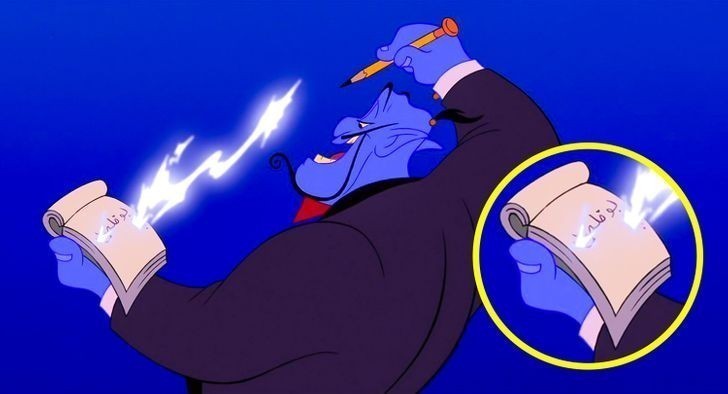 Jeden z najbardziej popularnych filmów Disneya, Aladyn, był inspirowany baśnią z Księgi tysiąca i jednej nocy. Te historie cieszyły się ogromną popularnością na Bliskim Wschodzie, a dzieło Disneya oddaje hołd arabskiej kulturze nawet w najmniejszych szczegółach. Jednym z nich jest scena, w której Dżin notuje wyimaginowane życzenia Aladyna. Wyraźnie widać, że zapisuje on kartkę od prawej do lewej strony, tak, jak jest to przyjęte w piśmie w krajach arabskich.