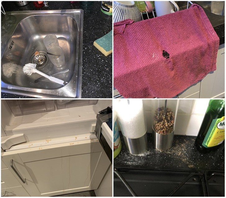 13. "Oto w jakim stanie zastaliśmy wynajęte przez nas mieszkanie. Brudne naczynia w zlewie, jakieś stare jedzenie..."