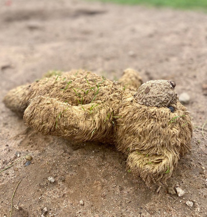 9. "Na pluszowym misiu mojego psa wyrosła trawa."