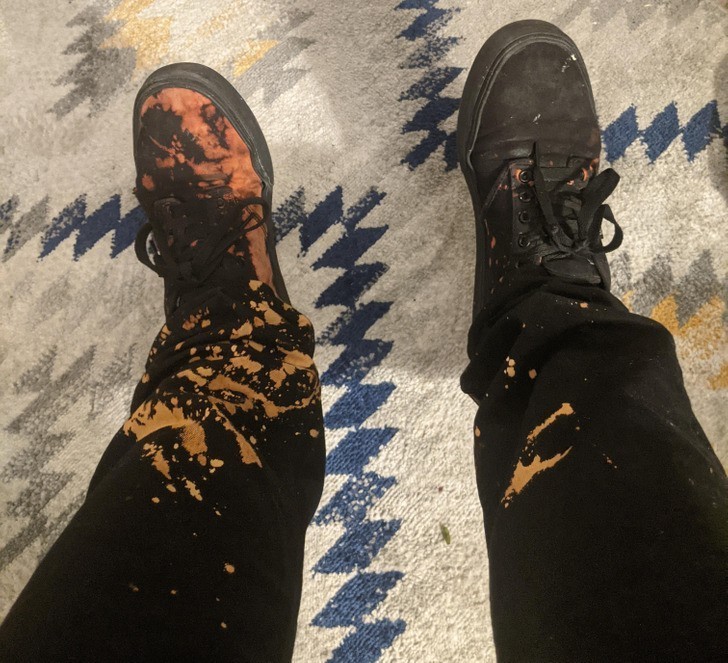 13. "Rozlałem wybielacz na moje nowe czarne spodnie."