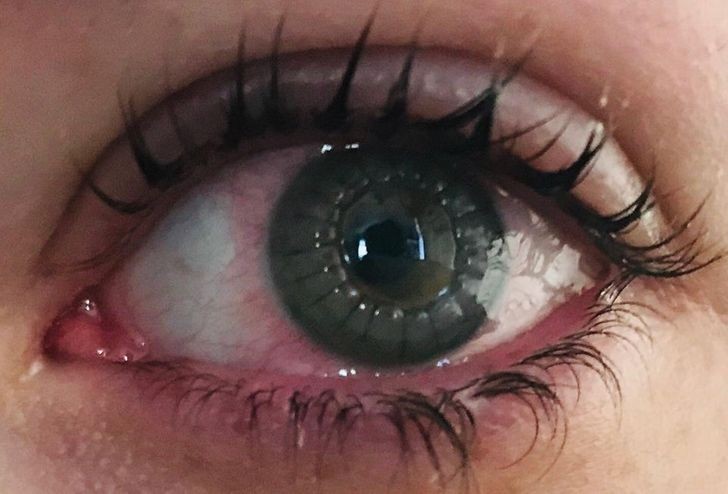 1. "Po operacji rogówki, szwy wciąż są widoczne w moim oku."
