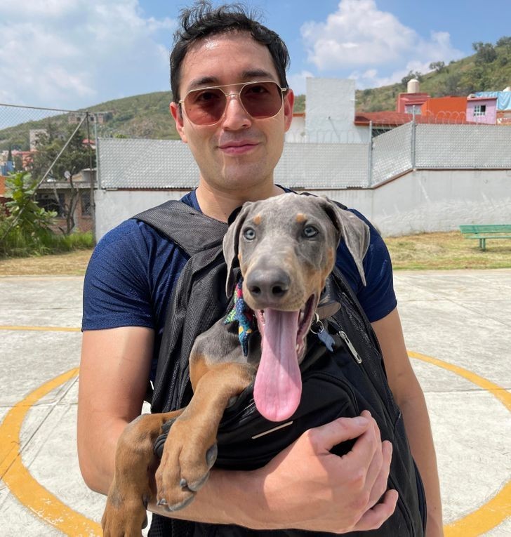 13. "Chłopak: 'Czy naprawdę potrzebujemy czwartego psa?' A teraz nosi ze sobą plecak na wypadek, gdyby nasz szczeniak zmęczył się chodzeniem."