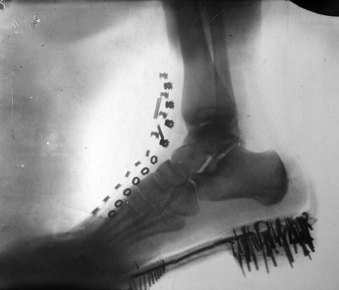10. Prześwietlenie stopy Nikoli Tesli z 1869 roku. Inżynier sam przeprowadził procedurę, wykorzystując zaprojektowaną przez siebie maszynę.