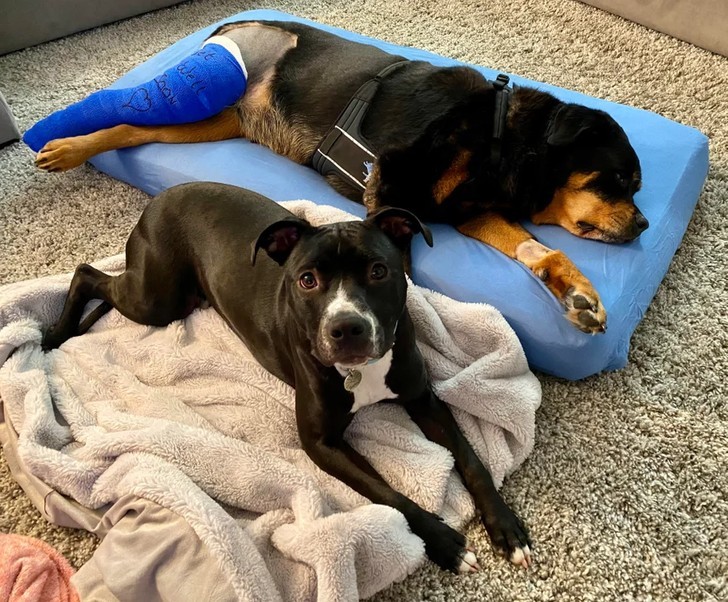 15. "Nasza chihuahua przeszła niedawno operację. Nasz drugi pies oferuje jej moralne wsparcie i śpi razem z nią na podłodze."