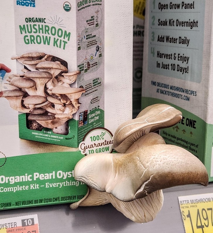 10. "Z tego nieotwartego zestawu do hodowli grzybów już wyrastają grzyby."