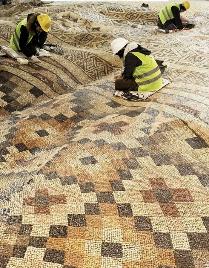 12. Mozaika w Turcji w trakcie wykopywania. Jej powierzchnia została wybrzuszona przez trzęsienia ziemi.