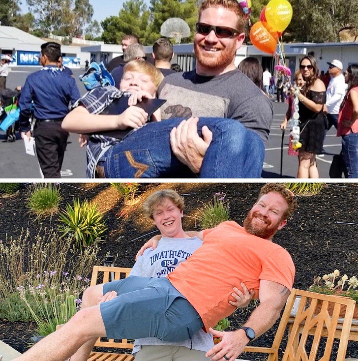 16. "Ja trzymający mojego syna na zakończeniu 8 klasy vs mój syn trzymający mnie na zakończeniu liceum"