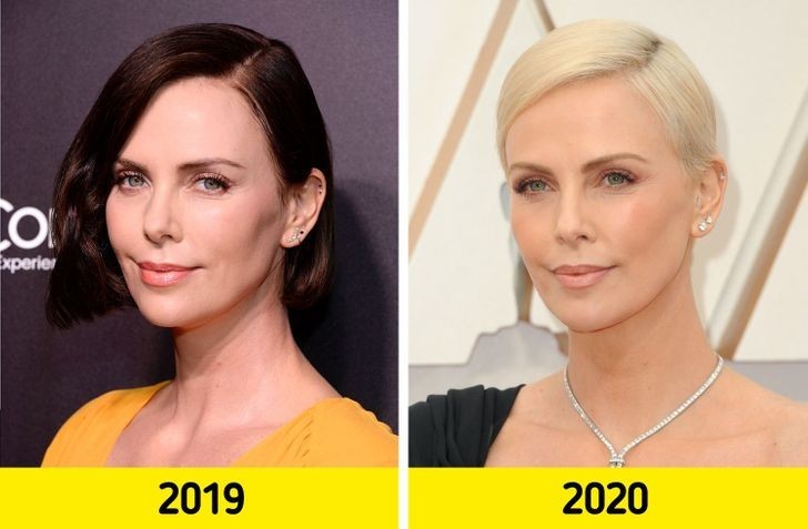 Charlize prezentuje się świetnie w różnych uczesaniach i kolorach. W 2019 roku zastąpiła swoje jasne włosy krótszą i ciemniejszą fryzurą, ale już rok później powróciła do blondu, choć skróciła je jeszcze bardziej.