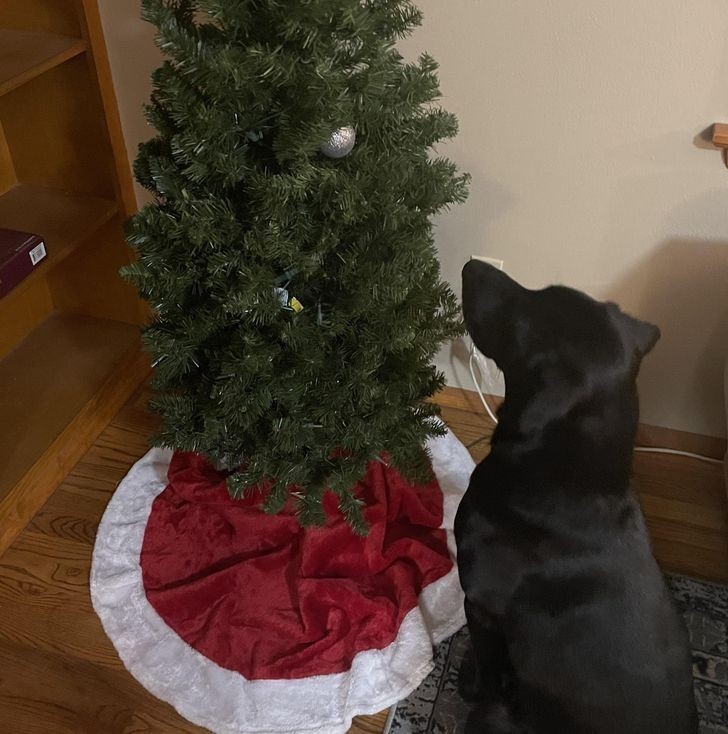 12. "Pierwsze święta mojego szczeniaka. Zawiesiłam jedną bombkę, a on już nie może się doczekać, by się nią pobawić."