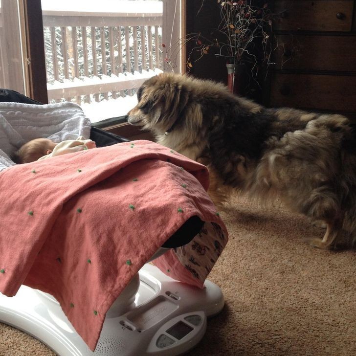 9. "Mój 18-letni pies ma problemy ze staniem. Odkąd Clare przyszła na świat, stoi przy niej i pilnuje jej godzinami. Dobry piesek!"