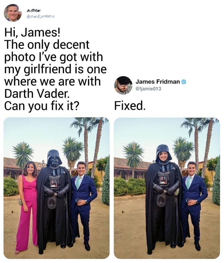 15. "Jedyne porządne zdjęcie jakie mam z moją dziewczyną to to z Darthem Vaderem. Możesz to naprawić?"