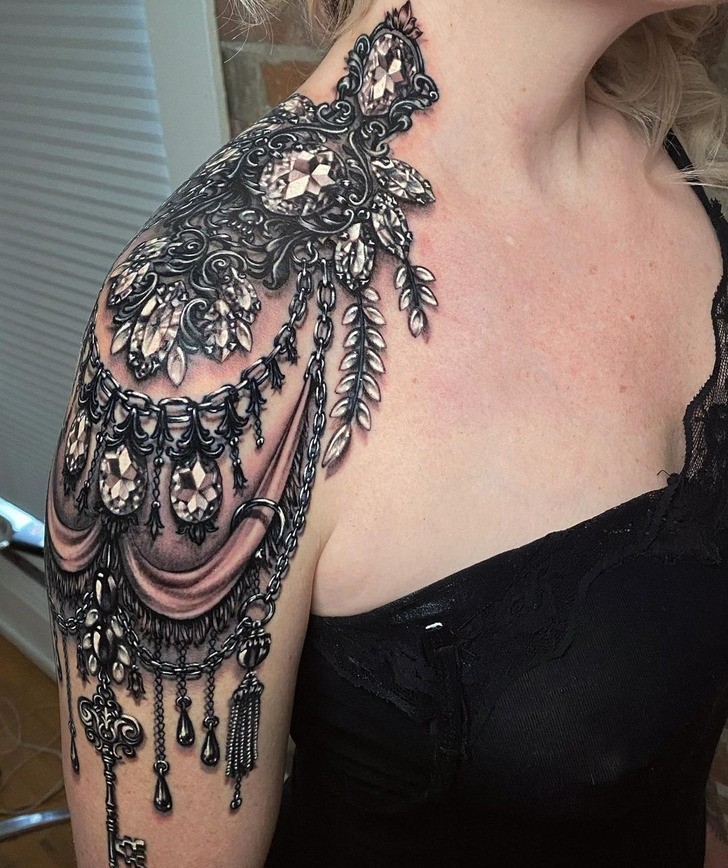 Jej znakiem rozpoznawczym są tatuaże w odcieniach czerni i szarości, wykorzystujące motywy biżuterii i koronek.